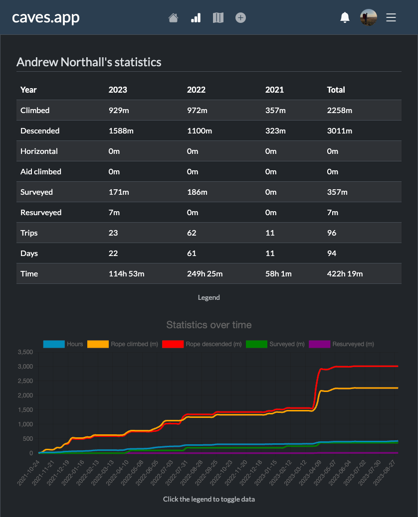 See your rope climbed, distance surveyed, unique caves visited, and much more.